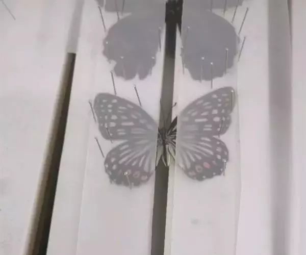 翅面黑色,有许多不规则尖形白斑,前翅中室内白斑分开,有二中列、一亚缘列白斑,后缘一室有二平行白条纹,后翅基半部脉间白色,端部有亚缘及缘小白斑列。翅反面似正面,但前翅顶角、后半部及后翅端区呈深褐色。