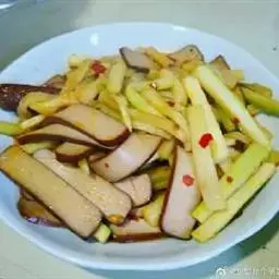2.取适量土豆粉用水稀释成土豆粉汁后,用锅煎成薄饼、切片,可以下火锅与鸡或猪蹄炖食,也可以和豆腐皮一起煮,还可与回锅肉混炒,是一道难得的餐桌佳肴。
