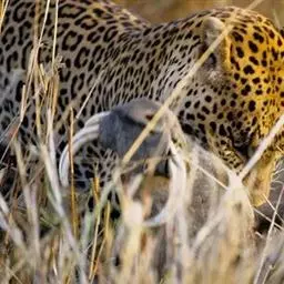 非洲豹有一套自己独特的捕猎的方法,它们可以在短时间内爆发很快的速度,当它把食物追的筋疲力尽的时候,它就把猎物扑倒在地,它就会伸出伸缩自如的爪子,用牙齿咬住它的喉咙,猎物的脖子上就会出现两个孔,猎物会马上死亡。但它狩猎并不是什么时候都成功的。非洲豹会选择比较容易捕获的猎物。它通过偷窥和伪装来捕获猎物,抓到的时候尽可能的快而且无声无息,它偏爱用树木或白蚁墩为自己寻找有利地点,去观察并计划策略,它们是直觉性的杀手,只要一有动静,它们马上就会开始侦测,捕猎的对象有:猴子、蛇、山羊、绵羊,吃的时候先用牙把皮剥开把骨头咬碎,为了减轻上树的负担,它先吃掉猎物的三分之一,然后再拖上树,上树之后,它也会保持高度的警惕。