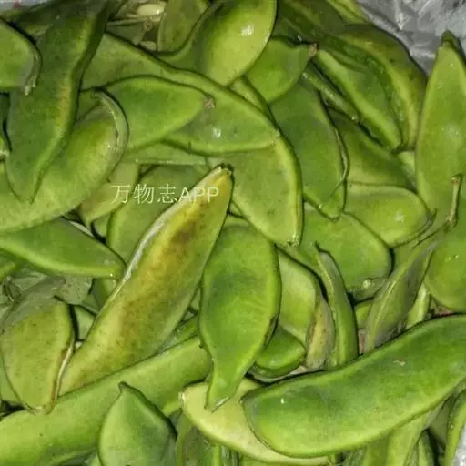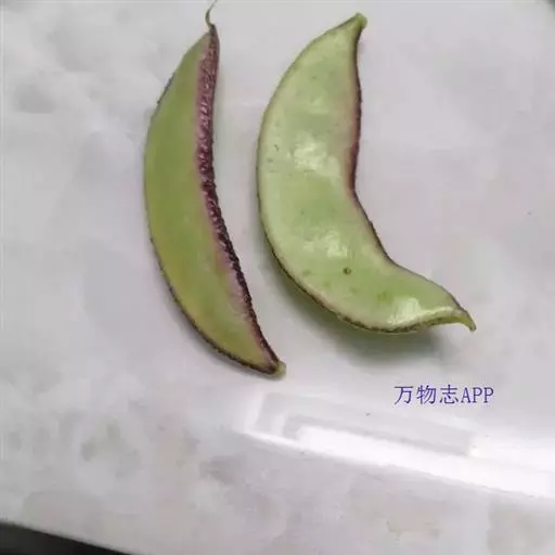 荚果长圆状镰形,长5-7厘米,近顶端最阔,宽1.4-1.8厘米,扁平,直或稍向背弯曲,顶端有弯曲的尖喙,基部渐狭;种子3-5颗,扁平,长椭圆形,在白花品种中为白色,在紫花品种中为紫黑色,种脐线形,长约占种子周围的2/5。花期4-12月。