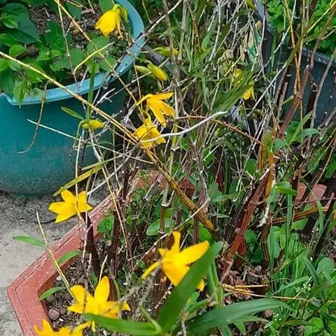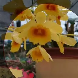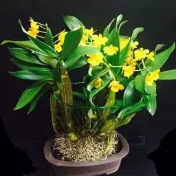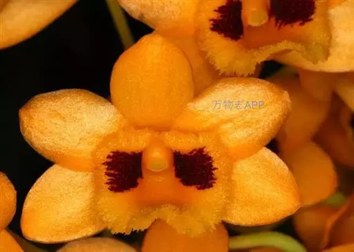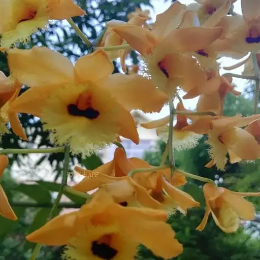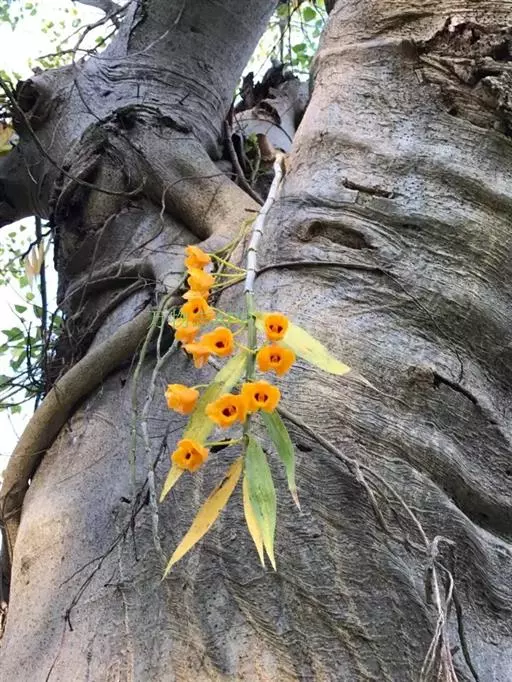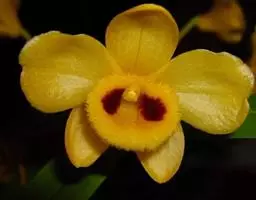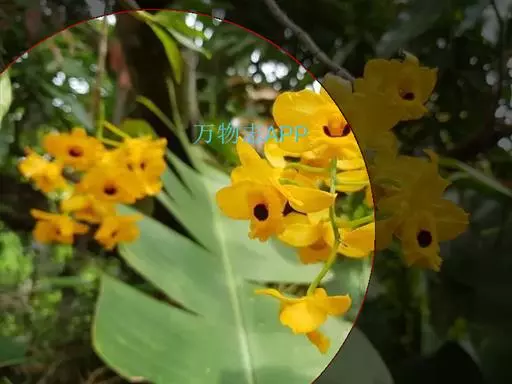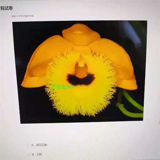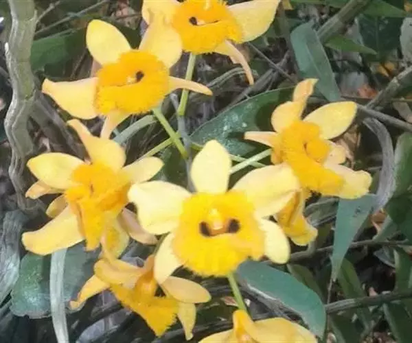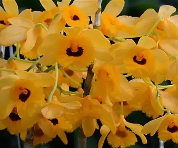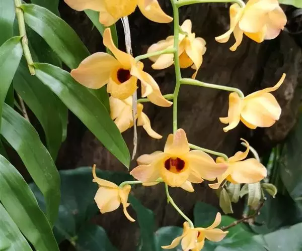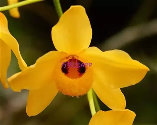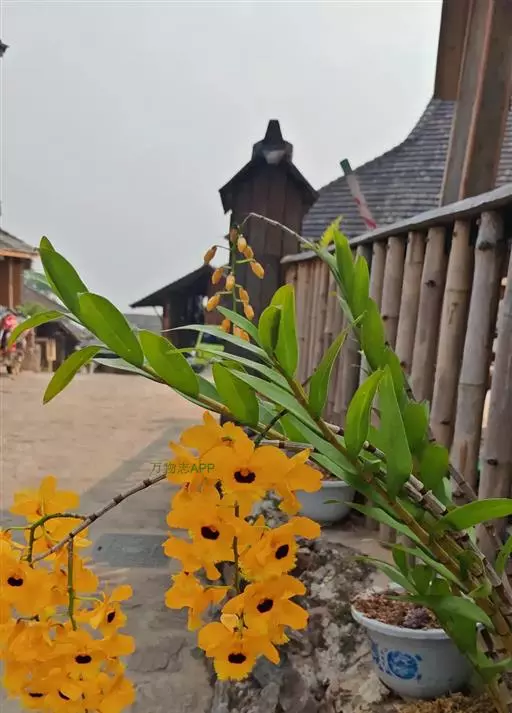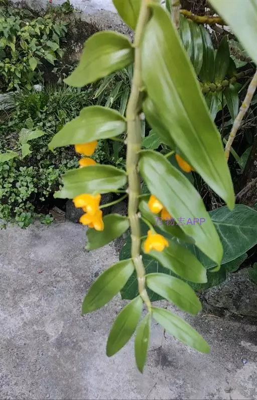 流苏石斛(学名:Dendrobium fimbriatum Hook.):茎粗壮,斜立或下垂,质地硬,圆柱形或有时基部上方稍呈纺锤形,不分枝,具多数节。叶二列,革质,长圆形或长圆状披针形。总状花序长5-15厘米,疏生6-12朵花;花金黄色,质地薄,开展,稍具香气;花瓣长圆状椭圆形,长1.2-1.9厘米,宽7-10毫米,先端钝,边缘微啮蚀状,具5条脉;唇瓣比萼片和花瓣的颜色深,近圆形,长15-20毫米,基部两侧具紫红色条纹并且收狭为长约3毫米的爪,边缘具复流苏。花期4-6月。