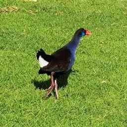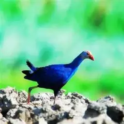 紫水鸡 紫水鸡,体大(42厘米)而壮,紫蓝色,红色的嘴特形大,除尾下覆羽为白色外,整个体羽蓝黑色并具紫色及绿色闪光。具一红色的额甲。 虹膜红色;嘴红色;脚红色。咕咕咯咯叫个不停;另有带鼻音的号角声wak。分布于古北界至非洲、东亚地区、澳大利亚及大洋洲。亚种poliocephalus为云南西南部的罕见繁殖鸟,可能在西藏极东南部也有分布。云南西部、广西及香港有迷鸟越冬记录。栖于多芦苇的沼泽地及湖泊,在水上漂浮植物及芦苇地中行走。有时结小群到漫水的开阔草地、稻田或火烧过后的草地上活动。尾上下抽动。