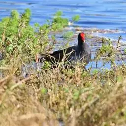 乌水鸡 乌水鸡是一种体型较大的水鸡,身体乌黑色,与我国的黑水鸡比较相似,但体型较大,大小与白骨顶相当,两胁没有白色细纹,腿红色。与白骨顶也比较相似,并可能混群在一起,但可以从嘴、骨顶和腿的颜色将二者区分开。叫声急促重复的“krurk”声。乌水鸡和黑水鸡几乎是镶嵌分布,黑水鸡几乎遍布世界各地,唯独不产于大洋洲,而乌水鸡则是大洋洲的土产。乌水鸡在澳大利亚东南部和西南部比较常见,在澳大利亚北部则比较罕见。乌水鸡出没于各种不同的湿地环境中,最喜欢边缘有茂密植物的开阔淡水水域,在城市公园的水塘中也能见到。繁殖通常在南部繁殖于9~11月,北部繁殖于1~4月。在芦苇或近水的植物中筑不很隐蔽的巢,产卵4~10枚。