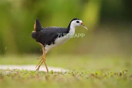 黑水鸡 黑水鸡,中等体型(31厘米),黑白色,额甲亮红,嘴短。体羽全青黑色,仅两胁有白色细纹而成的线条以及尾下有两块白斑,尾上翘时此白斑尽显。 虹膜红色;嘴暗绿色,嘴基红色;脚绿色。响而粗的嘎嘎作叫pruruk-pruuk-pruuk。除澳大利亚及大洋洲外,几乎遍及全世界。冬季北方鸟南迁越冬。亚种indica繁殖于新疆西部,包括天山;指名亚种繁殖于华东、华南、西南、海南岛、台湾及西藏东南部的中国大部地区。越冬在北纬32°以南。多见于湖泊、池塘及运河。栖水性强,常在水中慢慢游动,边在水面浮游植物间翻拣找食。也取食于开阔草地。于陆地或水中尾不停上翘。不善飞,起飞前先在水上助跑很长一段距离。