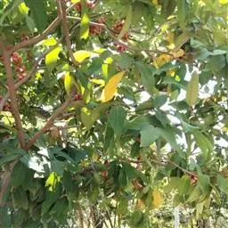 果腐病原菌侵害蒲桃的叶片及果实。果实受害较严重,果实发病初期形成水渍状、褪色斑或淡紫色斑。病斑扩大呈圆形,表面散生分生孢子堆,呈黑色小点状突起,果肉色泽变淡,出现黄褐色或淡紫色斑点,最后变成深紫色或黑色。病果常悬挂在枝条上,并不立刻坠地,后期果实脱水皱缩干枯,呈干枯状而坠落地面。受害叶片上形成不规则褐色病斑,后期有黑色小点散生于病斑表面。