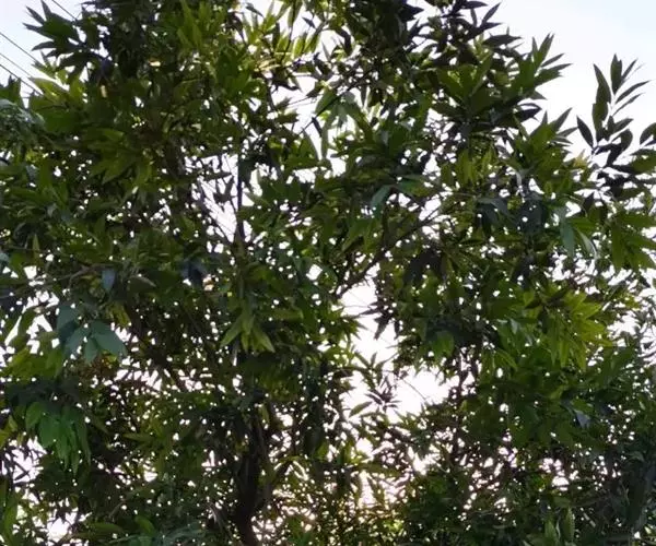 乔木,高10米,主干极短,广分枝;小枝圆形。叶片革质,披针形或长圆形,长12-25厘米,宽3-4.5厘米,先端长渐尖,基部阔楔形,叶面多透明细小腺点,侧脉12-16对,以45度开角斜向上,靠近边缘2毫米处相结合成边脉,侧脉间相隔7-10毫米,在下面明显突起,网脉明显;叶柄长6-8毫米。
