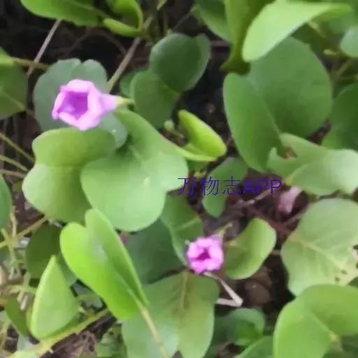 甘薯属 Ipomoea多年生常绿匍匐草本植物,茎紫红色,基部木质化,节上生不定根。叶互生,叶片厚纸质,宽椭圆形或近圆形,或肾形,长3~7厘米,宽2~6厘米,先断微凹或2裂,裂片圆,基部宽楔形、截形至浅心形,下面中脉近基部两侧各有一枚腺体,侧脉8~10对;叶柄长2~10厘米。多歧聚伞花序腋生,有数朵花,有时仅一朵发育;总花梗粗壮,长3.5~8厘米;花梗长1.5~3厘米;苞片小,宽卵形,早落;萼片厚纸质,卵形,外萼片长7~9毫米,内萼片长8~10毫米,先断圆盾,具小尖头;花冠白色或紫红色,漏斗状,长4.5~5厘米;雄蕊不等长,内藏;子房四室。蒴果卵圆形,径约1.5~2厘米,四瓣裂。种子径约7毫米,密被褐色茸毛。花果期5~10月。