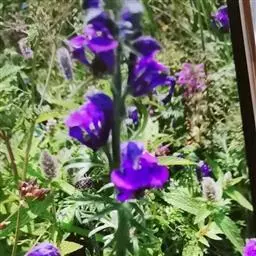 总状花序顶生或腋生,顶生的有7-14花,长11-14.5厘米;轴被反曲的短毛;下部苞片叶状,上部苞片线形;花梗长2-5.5厘米,密被伸展的柔毛;小苞片生花梗上部或中部附近,线形,长5-10毫米,宽0.5-1毫米;萼片蓝色,外面疏被短柔毛,上萼片高盔形或盔形,高1.5-2厘米,下缘稍凹自基部至喙长1.1-1.5厘米;花瓣无毛,瓣片长约10毫米,宽约3.5厘米,唇长约6毫米,距长约1.5毫米,向后弯曲;雄蕊无毛,花丝大多全缘;心皮5,子房上部疏生短毛或无毛。