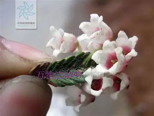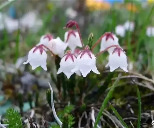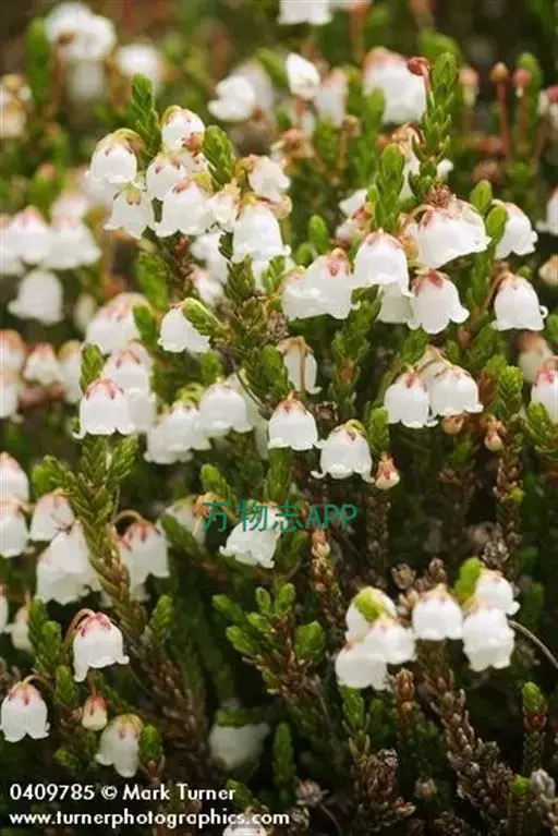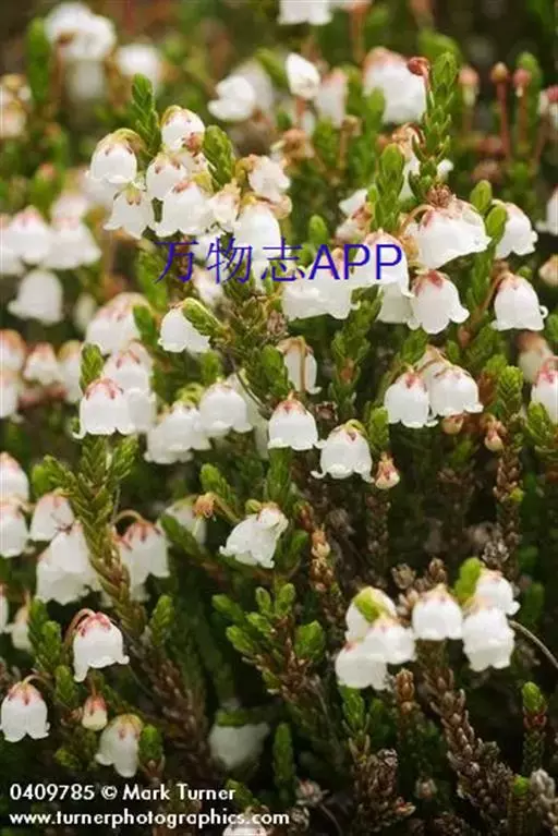 常绿矮小半灌木,高5-25厘米;枝条多而密,外倾上升或铺散成垫状,小枝长5-7厘米,直径2-2.4毫米,无毛,密生交互对生的叶。叶硬革质,披针形至披针状长圆形,长2-3毫米,宽(0.7-)1-1.7毫米,基部稍宽,2裂叉开,顶端稍钝,幼时具1长达0.75毫米的紫红色芒刺,背面龙骨状隆起,有1深纵沟槽,向上几达叶顶端,背面有光泽,无毛,腹面近凹陷,被微毛,边缘被纤毛,以后变无毛,留下疏齿状的残余或全缘。花单朵腋生;花梗长1.5-2.2厘米,有时更短,被蛛丝状长柔毛,顶部下弯,花下垂,基部为苞片所包围;花萼5,绿色或紫红色,裂片卵状披针形或披针形,长2.5-3毫米,无毛;花冠乳白色,宽钟状,长7-10毫米,两面无毛,口部5浅裂,裂片宽三角形;雄蕊10枚,较花冠短,花丝长5-7毫米,被柔毛。蒴果球形,直径5-8毫米,无毛,花柱宿存。花期4-5月,果期6-7月。 [1-2]