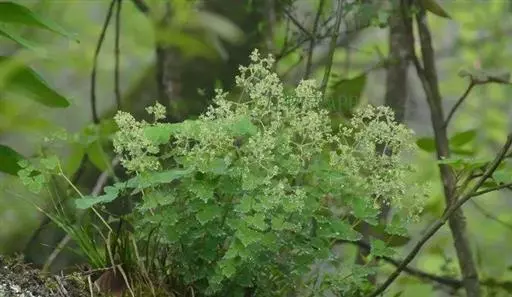 聚伞圆锥花序,长5-15厘米,宽2.5-8厘米,多次三叉分枝;雌雄异株,稀两性花;雄花小,多,萼片4,披针形,长0.5毫米;花瓣4,黄绿色,匙形,长1.5毫米;雄蕊8,较花瓣短;鳞片4,楔状四方形,长0.3毫米;心皮4,小;雌花萼片、花瓣各4,绿色或紫色,线形,长1.2毫米,鳞片4,近半圆形,长0.5毫米;心皮4,卵形,叉开的,长1.5毫米,基部合生。