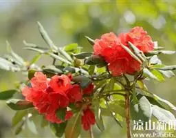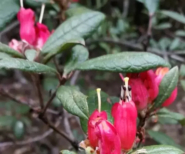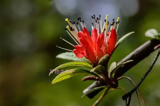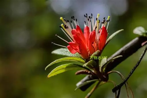 爆杖花(学名:Rhododendron spinuliferum Franch.):灌木,高0.5-3.5米。幼枝被灰色短柔毛,杂生长刚毛,老枝褐红色,近无毛。叶坚纸质,散生,叶片倒卵形、椭圆形、椭圆状披针形或披针形,。花序腋生枝顶成假顶生;花冠筒状,两端略狭缩,长1.5-2.5厘米,朱红色、鲜红色或橙红色,上部5裂,裂片卵形,直立。蒴果长圆形,长1-1.4厘米,被疏茸毛并可见鳞片。花期2-6月。