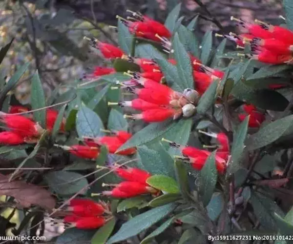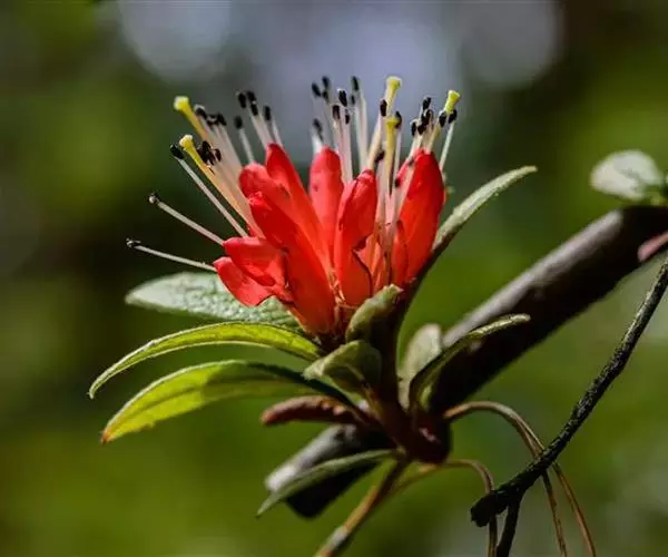 花序伞形,有2-4花;花梗长0.2-1厘米,连同花萼密被灰白色柔毛和鳞片;花萼浅杯状,无裂片;花冠筒状,两端略狭缩,长1.5-2.5厘米,朱红色、鲜红色或橙红色,上部5裂,裂片卵形,直立,花冠外面洁净,稀于裂片中部至筒部条状被短柔毛;雄蕊10,不等长,略伸出花冠之外,花药紫黑色,花丝无毛,稀基部有短柔毛;子房5室,密被茸毛并覆有鳞片,花柱长伸出花冠之外,无毛稀基部被短柔毛。