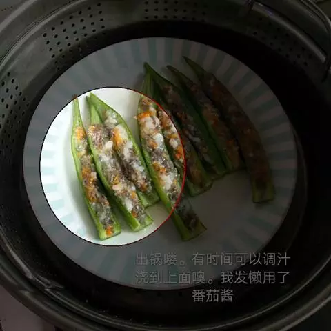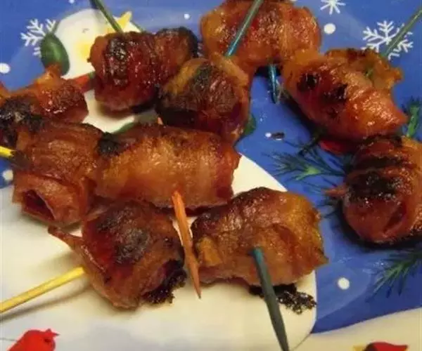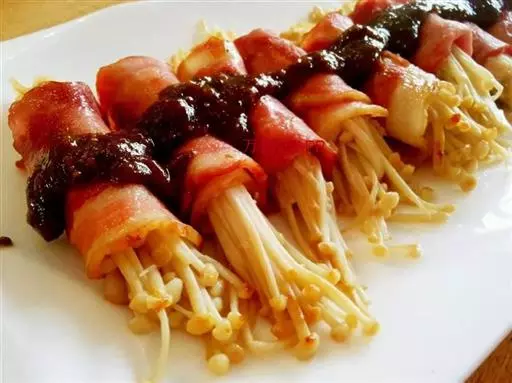 5、每片培根卷鼓鼓的卷进炒好的金针菇,用牙签固定。