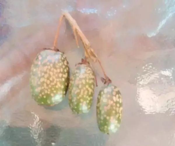 果乳头状至矩圆圆柱状,长可达5厘米,有显著淡褐色圆形斑点,具反折的宿存萼片。种子长2-2.5毫米。