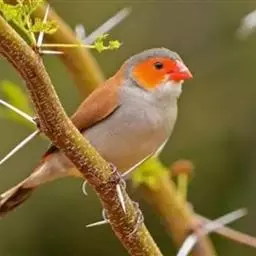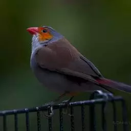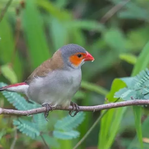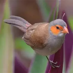 橙颊梅花雀体长约10厘米,头部灰色,两侧有大块橙色区域,嘴基及眼下方有黑纹,两条黑纹间呈白色,…