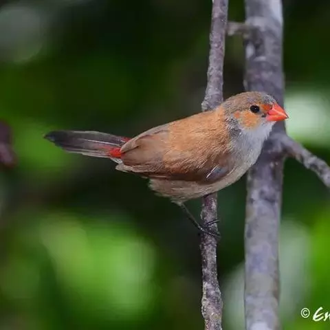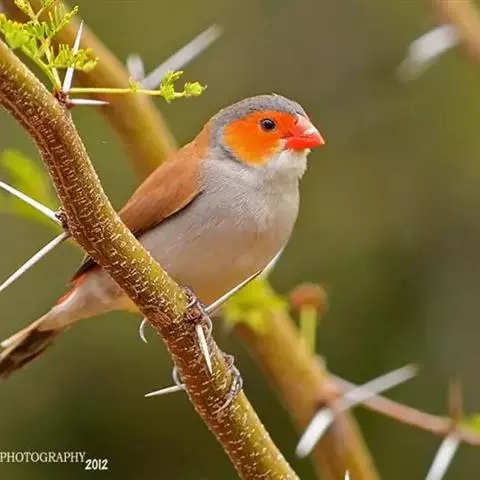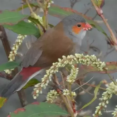 红梅花雀小型鸟类,体长9-10厘米。雄鸟通体朱红色,背、肩、胸等满布白色小斑点,…