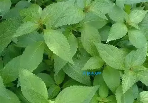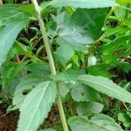 茎叶对生,卵圆形或卵圆状披针形或披针形,长3.5-10厘米,宽1.5-4.5厘米,先端近渐尖,基部楔形,边缘具粗大内弯的锯齿,草质,上面暗绿色,下面淡绿色,两面仅脉.上密被微柔毛,余部无毛,散布淡黄色腺点,侧脉每侧4-55与中脉在两面微隆起,在边缘之内网结,其间平行细脉多少明显;叶柄长0.5-3.5厘米,上部具渐宽大的翅,腹凹背凸,密被微柔毛。