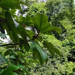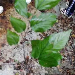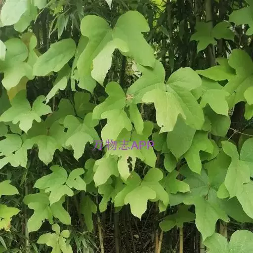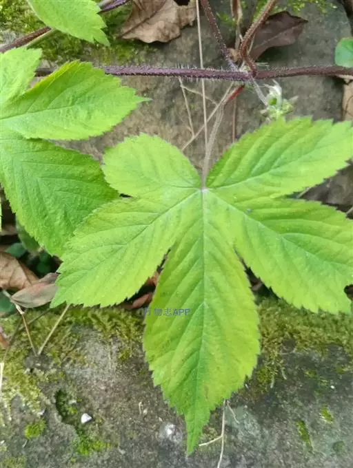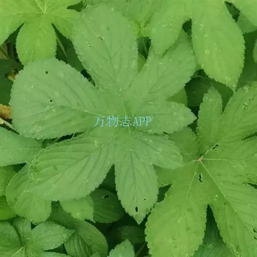 叶纸质,肾状五角形,掌状5-7深裂稀为3裂,长宽约7-10厘米,基部心脏形,表面粗糙,疏生糙伏毛,背面有柔毛和黄色腺体,裂片卵状三角形,边缘具锯齿;叶柄长5-10厘米。雄花小,黄绿色,