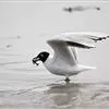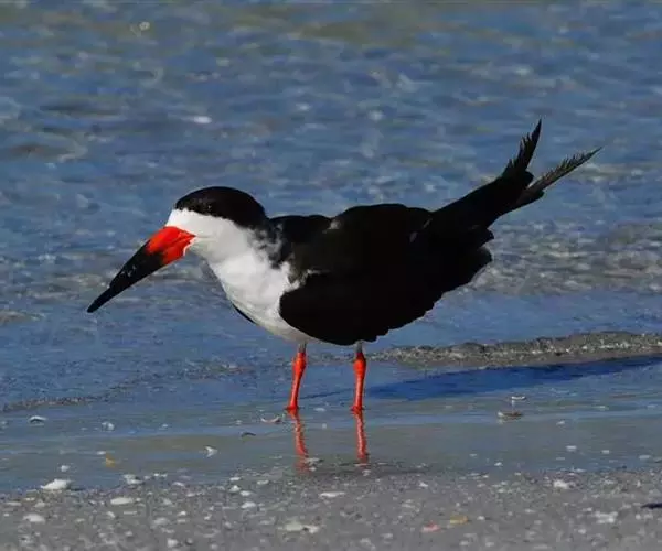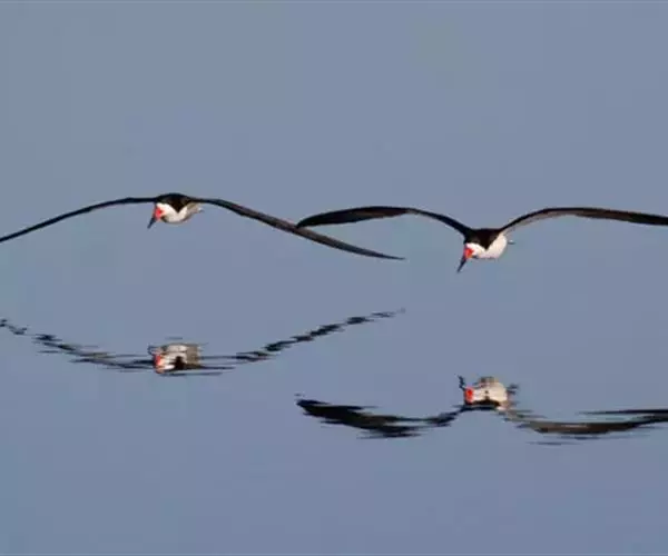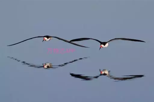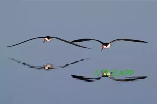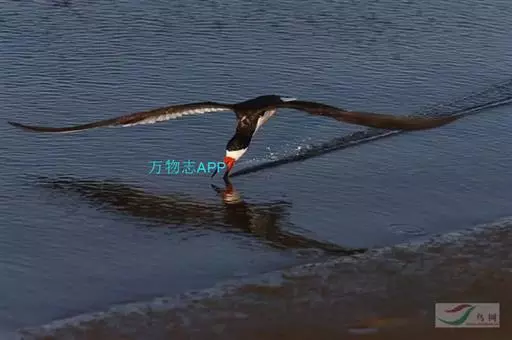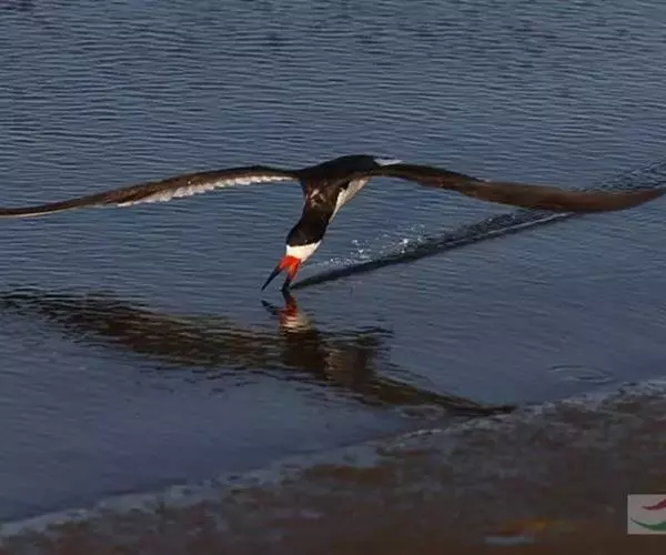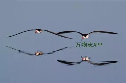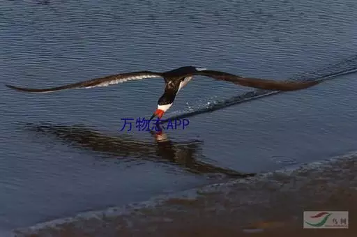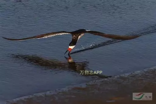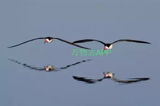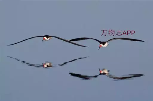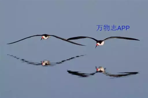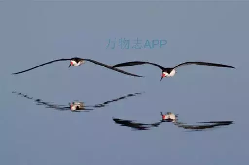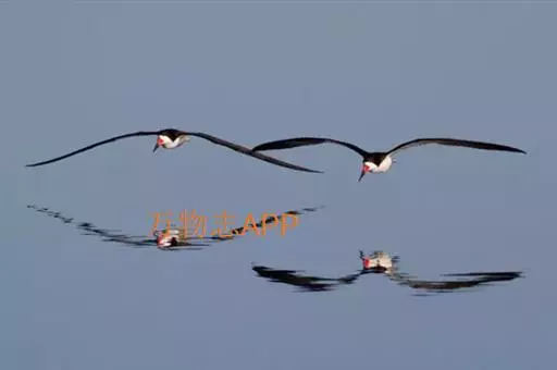 剪嘴鸥下喙比上喙长,捕食时紧贴水面飞行,将下喙叉入水中分水从而将食物送入嘴中。
