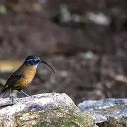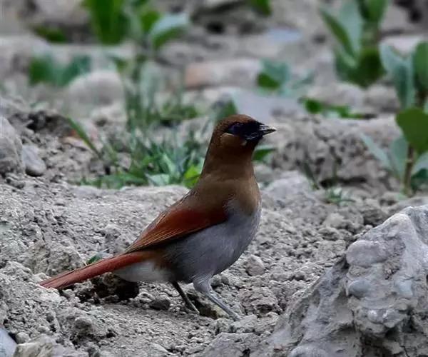 棕噪鹛(学名:Garrulax poecilorhynchus)中型鸟类,体长25~28厘米。上体赭褐色,头顶具黑色羽缘,尾上覆羽灰白色,尾羽棕栗色,外侧尾羽具宽阔的白色端斑。额、眼先、眼周、耳羽上部、脸前部和颏黑色,眼周裸皮蓝色,极为醒目。喉和上胸与背同色,下胸至腹蓝灰色。腹部及初级飞羽羽缘灰色,臀白。该种与灰胁噪鹛在体型大小和羽色上都非常相似,野外不易区别。但灰胁噪鹛下体仅颏尖黑色,其余下体白色而沾有灰色,两胁暗灰色。