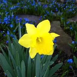 鳞茎较小,叶狭线形,表面有凹沟,鲜绿色。花茎与叶等长。顶生花2~6朵,鲜黄色,副花冠也为鲜黄色,边缘波状。花期3月下旬~4月中旬,单朵花开放7~10天,芳香。耐寒,鳞茎