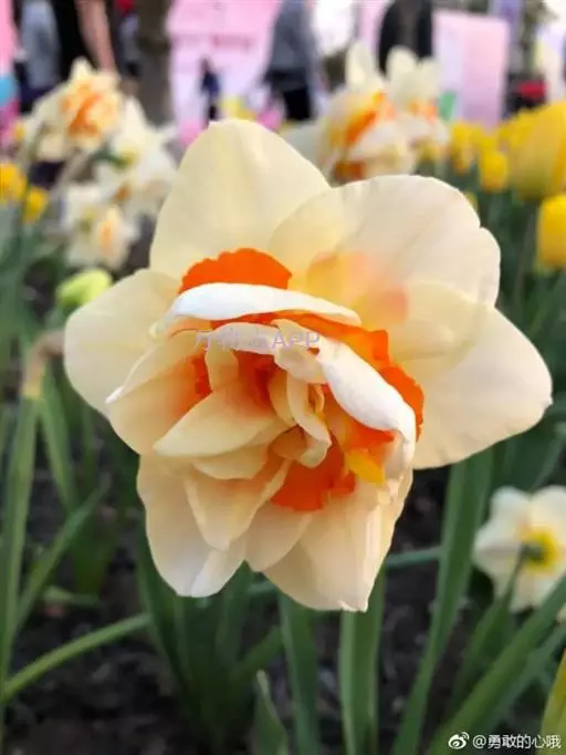 观赏价值极高的重瓣洋水仙,花瓣多为金黄色,内夹少量由花蕊突变而来的深红色花瓣。