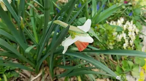 原产法国、希腊至地中海沿岸。鳞茎较小,叶宽线形,粉绿色。花茎花葶与叶等长或略高。顶生一花。花被片纯白,副花冠浅杯状,边缘红色,颇为娇艳,有芳香。花期4月。休眠期很短,宜早栽种。