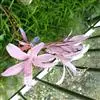 石蒜(叶) 陕西石蒜为多年生草本。鳞茎近球形,直径约5厘米。早春出叶,叶带状,长约50厘米,中部最宽处达1.8厘米,基部宽约0.8厘米,顶端钝圆,中间淡色带不明显。 花茎高约50厘米;总苞片2枚,淡粉红色,阔披针形或披针形,长5-7厘米,基部最宽处达1.2厘米;伞形花序有花5-8朵;花白色,花被裂片腹面散生少数淡红色条纹,背面具红色中肋,反卷和微皱缩,花被筒长约2厘米;雄蕊比花被短,花丝淡紫红色;雌蕊略伸出于花被外,花柱顶端紫红色。花期8-9月。 果未见。