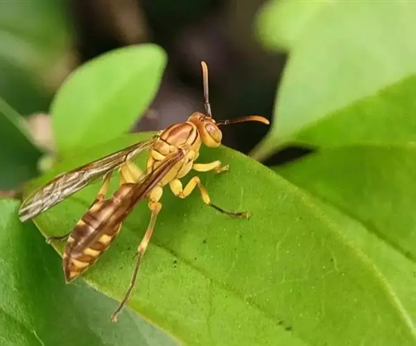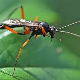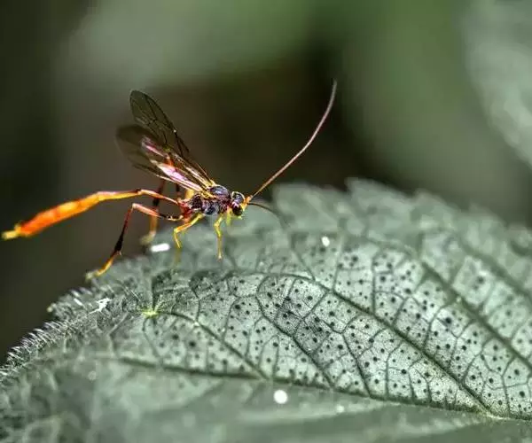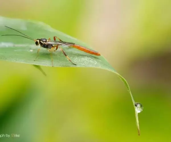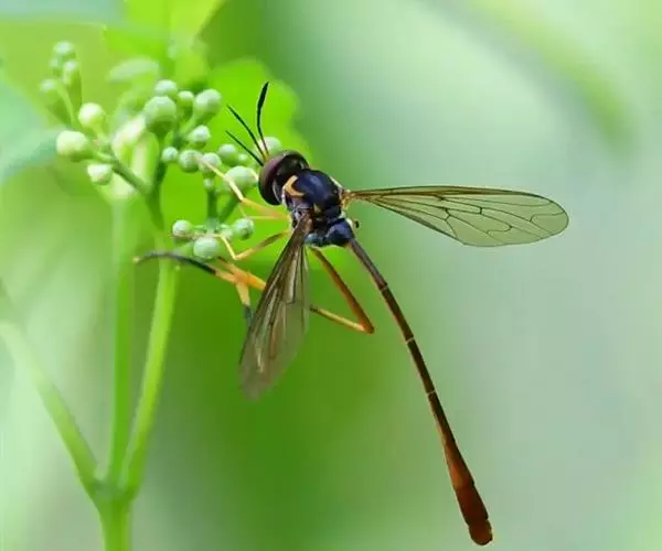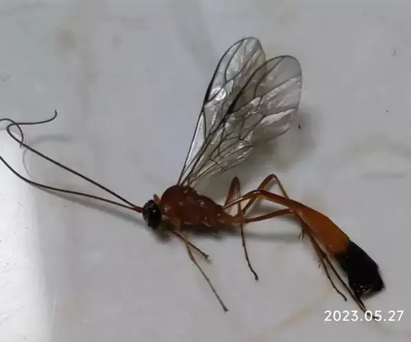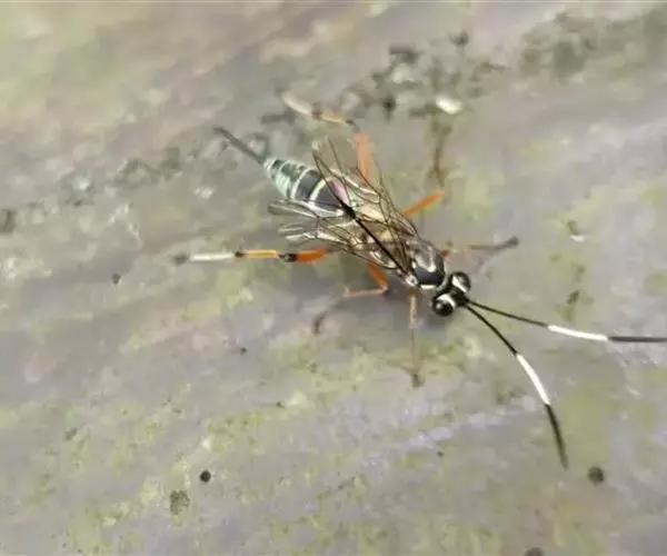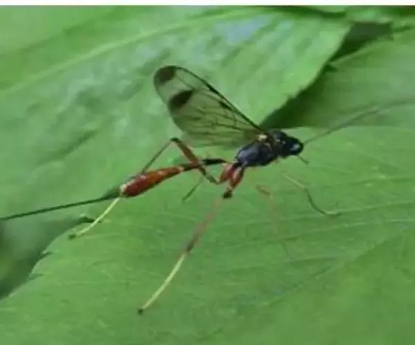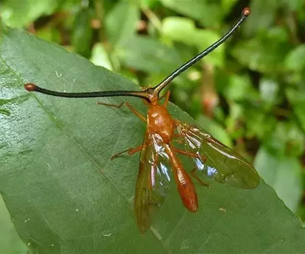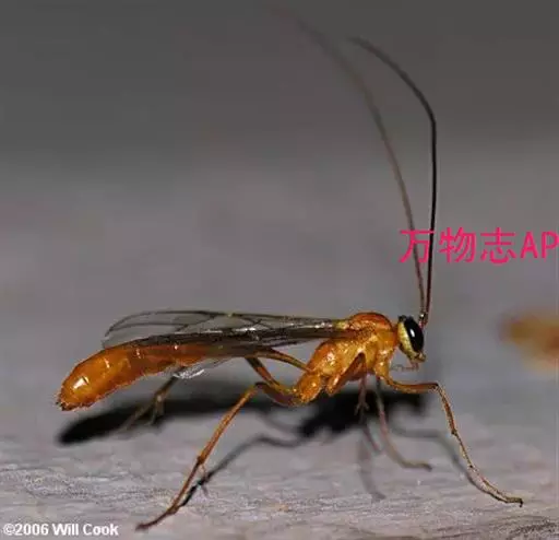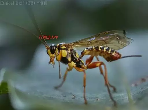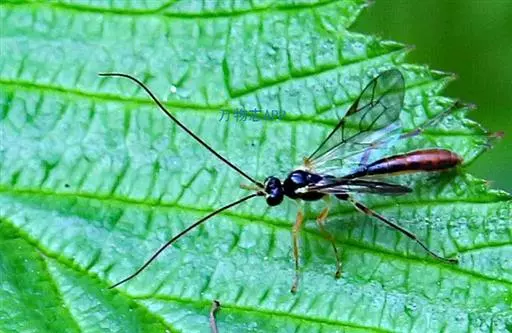 在昆虫世界中,有一种蜂生来体形娟瘦,头前一对细长的触角,尾后拖着三条宛如彩带的长丝,再加上两对透明的翅膀,飞起来,摇摇曳曳,甚有飘然欲仙之意,煞是好看!大概也正是因为这个缘故,这一类蜂就有了一个“姬蜂”的雅名。姬蜂大多是黄褐色,尾后的长带只有雌蜂才有,那是一条产卵器和两旁产卵器的鞘形成的三条长丝。这么长的产卵器也是昆虫中不多见的,有的种类甚至超过自己的体长呢。