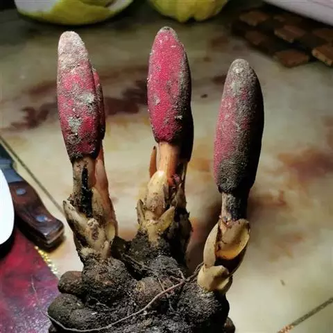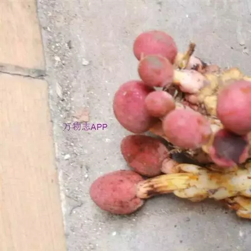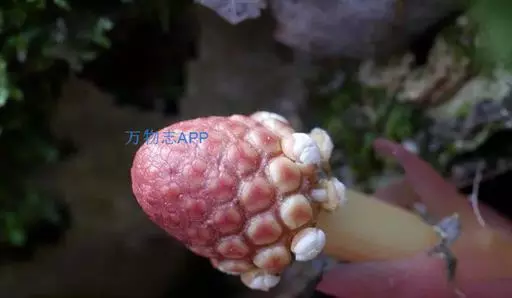 草本,高2.5-9厘米;根茎苍褐色,扁球形或近球形,干时脆壳质,直径25-5厘米,分枝或不分枝,表面粗糙,密被小斑点,呈脑状皱褶;花茎长2-5.5厘米,淡红色;鳞苞片5-10枚,多少肉质,红色或淡红色,长圆状卵形,长1.3-2.5厘米,宽约8毫米,聚生于花茎基部,呈总苞状。花雌雄异株(序);花序近球形或卵圆状椭圆形;雄花序轴有凹陷的蜂窠状洼穴;雄花3数,直径1.5-3毫米;花被裂片3,阔三角形;聚药雄蕊有3枚花药;花梗初时很短,后渐伸长达5毫米,自洼穴伸出;雌花的子房黄色,卵形,通常无子房柄,着生于附属体基部或花序轴表面上,花柱丝状;附属体暗褐色,倒圆锥形或倒卵形,顶端截形或中部凸起,无柄或有极短的柄,长0.8毫米,宽0.6毫米。花期9-11月。