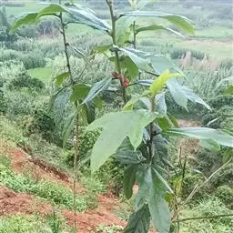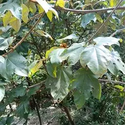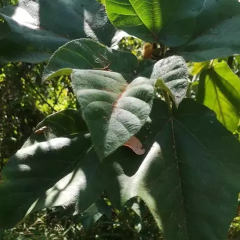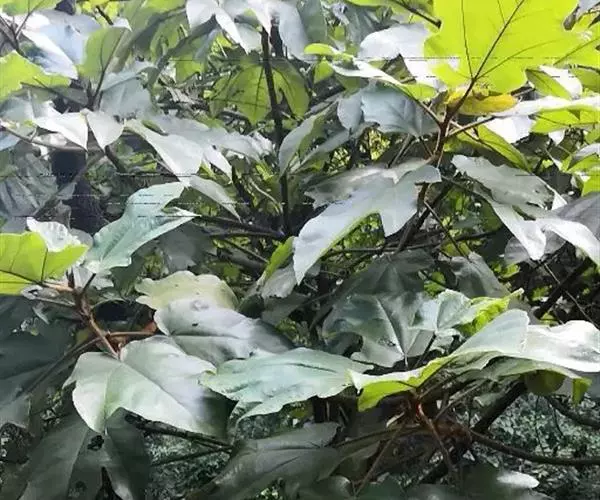 小乔木或灌木,高约4-10米,树皮灰褐色,具纵棱;幼枝中空,被褐黄色硬长毛。叶互生,纸质,广卵形,长17-27厘米,宽12-20厘米,急渐尖,具长约1厘米尖尾, 基部浅心形,表面疏生糙伏状长毛,背面被长约3毫米褐黄色波状长毛,以中脉和侧脉 稠密,余均密被黄色和灰白色绵毛,基生侧脉每边3条,侧脉每边5-6条,分裂或不分 裂,边缘有细锯齿,齿端被长毛;叶柄长5-11 厘米,细长,疏生长硬毛;托叶披针形, 长约1-1.5厘米,早落。