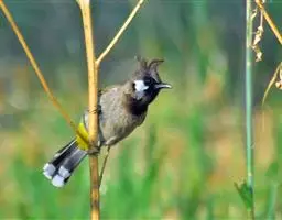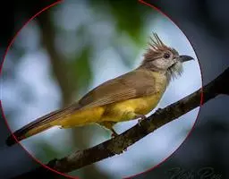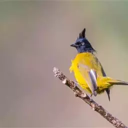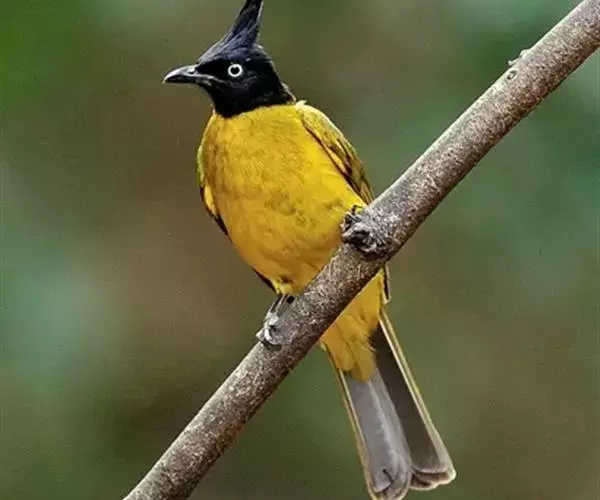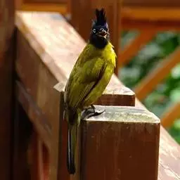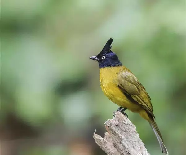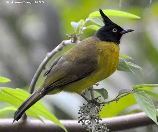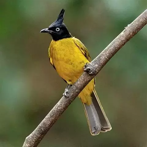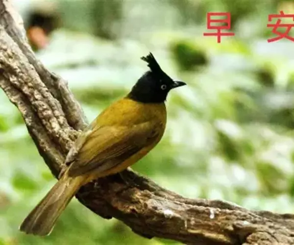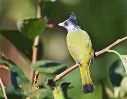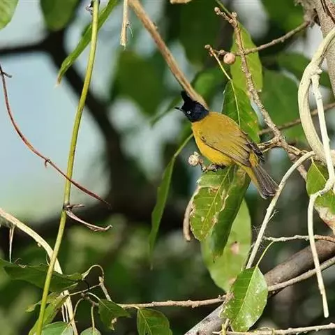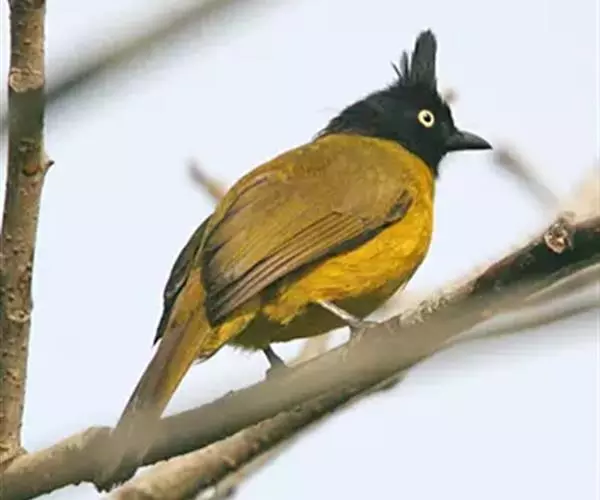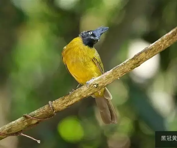 黑冠黄鹎(学名:Pycnonotus melanicterus):体长18-21厘米,是一种中等体型偏黄色鹎。整个头、颈、颏、喉黑色,头顶有显著直立的羽冠,黑色,上体褐橄榄黄绿色,下体橄榄黄色。虹膜偏红;嘴及脚黑色。
