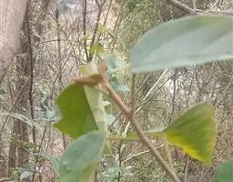 叶互生,纸质,叶片菱形、菱状卵形或稀有菱状倒卵形,长3-8厘米,宽3-9厘米,顶端骤然紧缩具长短不等的尖头,基部阔楔形或钝,全缘;中脉两面微凸起,侧脉6-10对,纤细,斜上升,离缘2-5毫米弯拱网结,网状脉明显;叶柄纤细,长2.5-6厘米,顶端具2腺体;托叶顶端钝,长约1毫米。