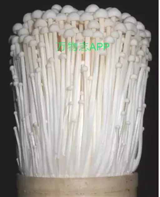 白金针菇 浙江省江山市微生物研究所菌株。出菇整齐,每丛200株左右,柄长15~23厘米,菌盖内卷,不易开伞。白色品系对光线不敏感,即使栽培环境有较强的散射光,子实体仍是通体洁白,有光泽,适合制罐或盐渍加工出口。