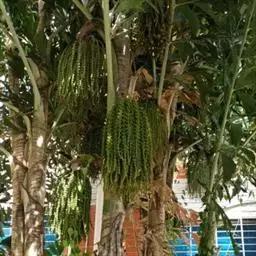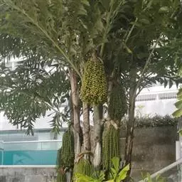 贝叶棕(学名:Corypha umbraculifera L.)是棕榈科,贝叶棕属植株高大粗壮乔木状植物,高可达25米,具较密的环状叶痕。叶片大,半月型,呈扇状深裂,裂片裂至中部,剑形,叶柄粗壮,上面有沟槽,边缘具短齿,花序顶生直立、圆锥形,序轴上由佛焰苞所包被,上面着生花;花两性,小,乳白色,有臭味。果实球形,种子近球形或卵球形,胚顶生。2-4月开花,翌年5-6月结果。