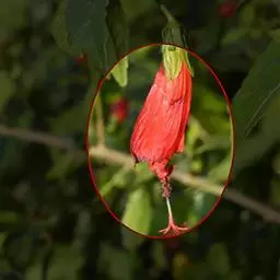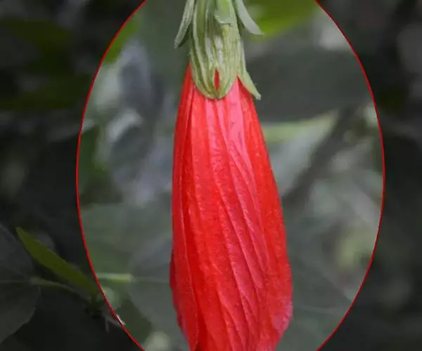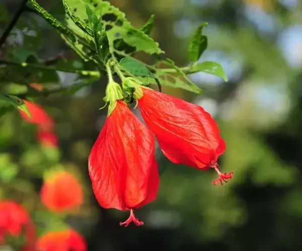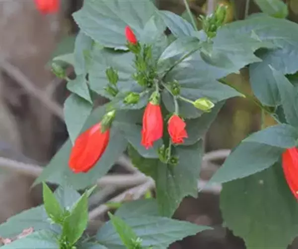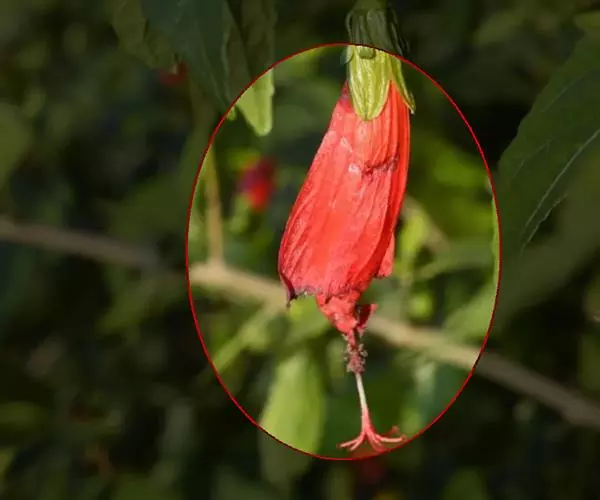 垂花悬铃花(学名:Malvaviscus penduliflorus Moc. & Sessé ex DC.)是锦葵科、悬铃花属常绿小灌木,外型略似朱槿,但叶片较为狭长浓绿;高30-60厘米,叶片互生,卵形或卵状矩圆形,单叶,有时浅裂,叶形变化较多,叶面具星状毛。花红色,花通常单生于上部叶腋处,下垂,花冠呈漏斗形,五枚花瓣略左旋作卷筒状,仅上部略微展开,雌雄蕊细长突出花瓣外,看似永远含苞待放。