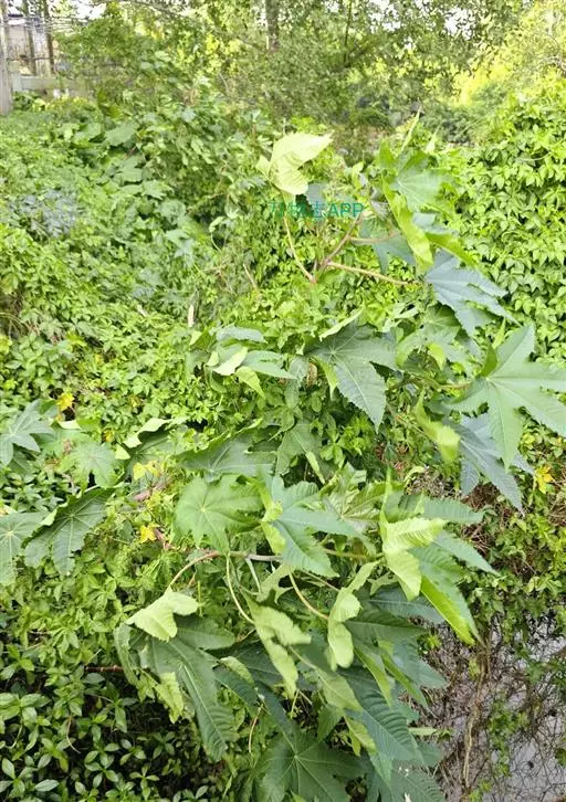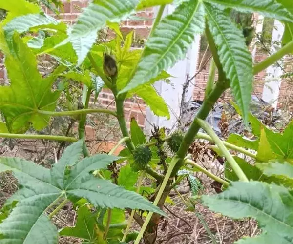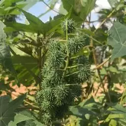 蓖麻(拉丁学名:Ricinus communis L.),为双子叶植物纲、大戟目、大戟科、蓖麻属一年生或多年生草本植物、热带或南方地区常成多年生灌木或小乔木。单叶互生,叶片盾状圆形。掌状分裂至叶片的一半以下,圆锥花序与叶对生及顶生,下部生雄花,上部生雌花;花瓣性同株,无花瓣;雄蕊多数,花丝多分枝;花柱,深红色。蒴果球形,有软刺,成熟时开裂。花期5-8月,果期7-10月。