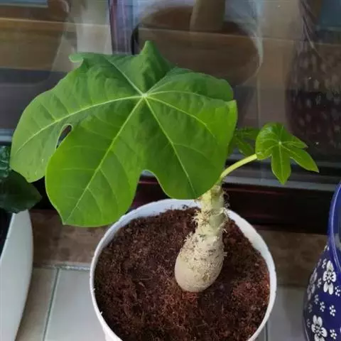 叶轮廓近圆形,长和宽达40厘米或更大,掌状7-11裂,裂缺几达中部,裂片卵状长圆形或披针形,顶端急尖或渐尖,边缘具锯齿。网脉明显;叶柄粗壮,中空,长可达40厘米,顶端具2枚盘状腺体,基部具盘状腺体;托叶长三角形,长2-3厘米,早落。