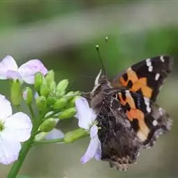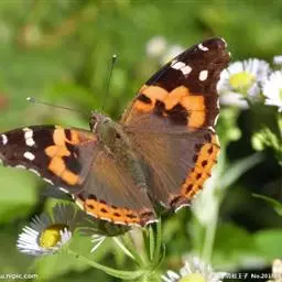 大红蛱蝶Vanessa indica Herbst,翅黑褐色,外缘波状。前翅M1脉外伸成角状,…