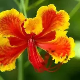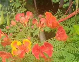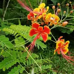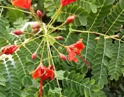 洋金凤 Sw.),豆科小凤花属灌木状或小乔木植物,枝无毛,绿或粉绿色;二回羽状复叶;总状花序伞房状,…