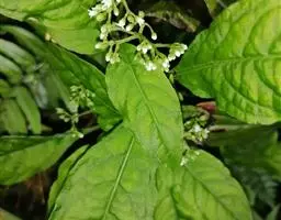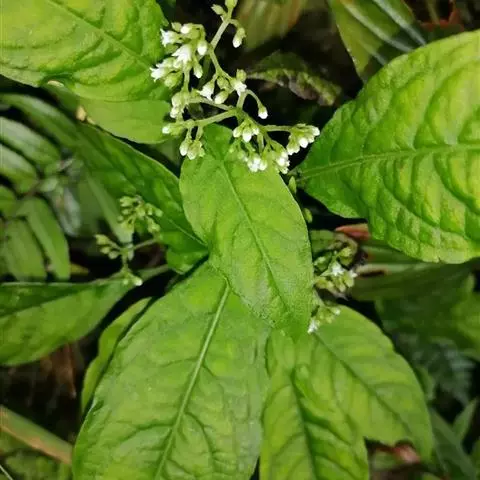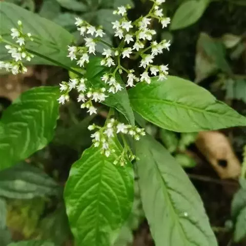 大叶度量草 多年生草本,高达60厘米。茎下部匍匐状;幼枝四棱形,老枝圆柱形;除幼叶下面、幼叶柄和花冠管喉部被短柔毛外,其余均无毛。叶片膜质至薄纸质,椭圆形、长椭圆形或披针形,有时倒披针形,长5-15厘米,宽2-5厘米,顶端渐尖至钝,基部楔形;侧脉每边8-10条;叶柄长1-2厘来;托叶退化或叶柄间成窄的叶鞘。三歧聚伞花序腋生或顶生,着花多朵;花序梗长3-7厘米;花梗长1-3毫米;苞片和小苞片披针形,长约1毫米;花萼5深裂,裂片卵状披针形,长约1毫米,宽0.5毫米,边缘膜质;花冠白色,坛状,花冠管长约1.5毫米,花冠裂片5,卵形,长约0.5毫米;雄蕊5,着生于花冠管近中部;子房近圆球形,光滑,花柱长0.5毫米,基部分离,柱头头状。蒴果近圆球状,直径2-2.5毫米,顶端有两尖角,基部有宿存花萼;种子圆球形,淡褐色,表面具小瘤状凸起。花期3-5月,果期6-7月。