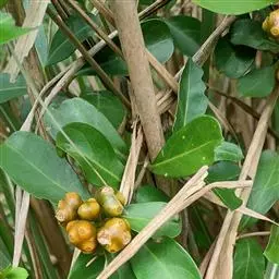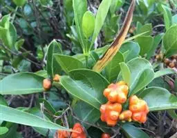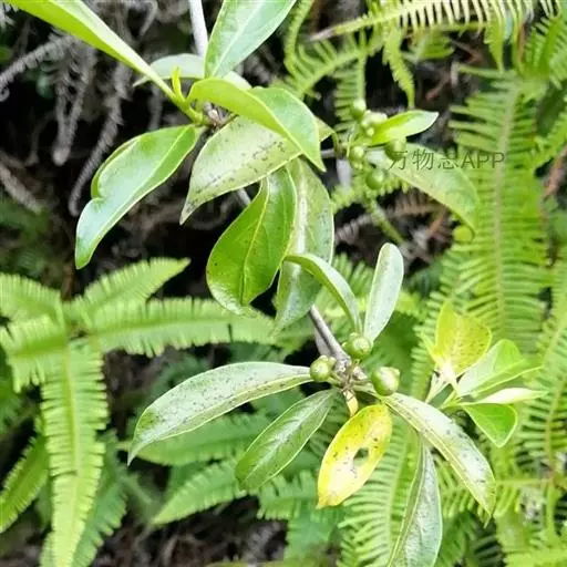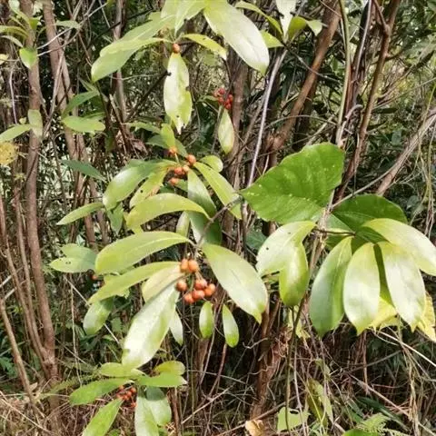 羊角藤,又名糠藤、乌苑藤。攀援灌木。无毛或幼枝稍被柔毛。叶薄革质,对生;叶柄长6-10mm;托叶膜质,长2-5mm;叶片形状各式,通常长圆状披针形,长5-8(-12)cm,宽1.5-3.5cm,先端急尖或短渐尖,基部楔形,侧脉5-7对。花序顶生,伞形花序式排列,通常由6个小头状花序组成,每个小头状花序直径6-8mm,有花6-12朵;总花梗长5-12mm;萼简半球形,长0.8-1mm,先端平截或不明显齿裂;花冠白色,4裂,几达基部,裂片狭长圆形,长3-3.2mm,先端稍钝而内弯;雄蕊4,聚合果扁球形或近肾形,直径8-12mm,熟时红色,有槽纹。花期5-7月,果期6-10月。