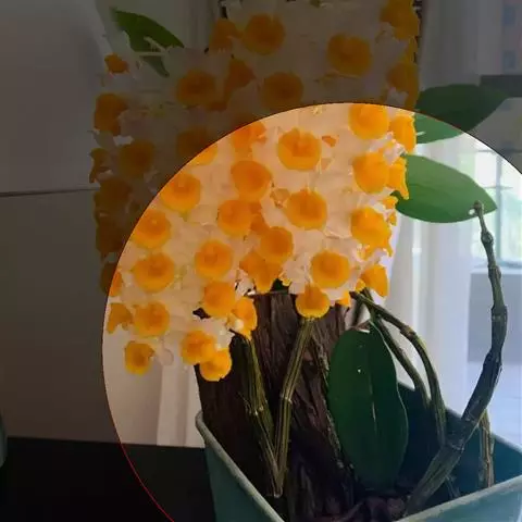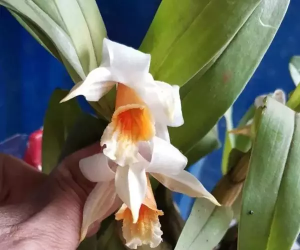 总状花序出自近茎端,常具1-2朵花;花序柄长5-10毫米,基部被3-4枚鞘;花苞片卵形,长4-5毫米,先端急尖;花梗和子房长约3厘米;子房黄绿色,三棱形;花开展,质地厚,具橘子香气;中萼片浅黄白色,卵状披针形,长约2.5厘米,宽9毫米,先端急尖,在背面中肋隆起呈翅状;侧萼片浅黄白色,斜卵状三角形,与中萼片近等大;萼囊淡黄色带橘红色,呈角状,长约2厘米,近先端处稍弯曲。