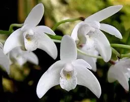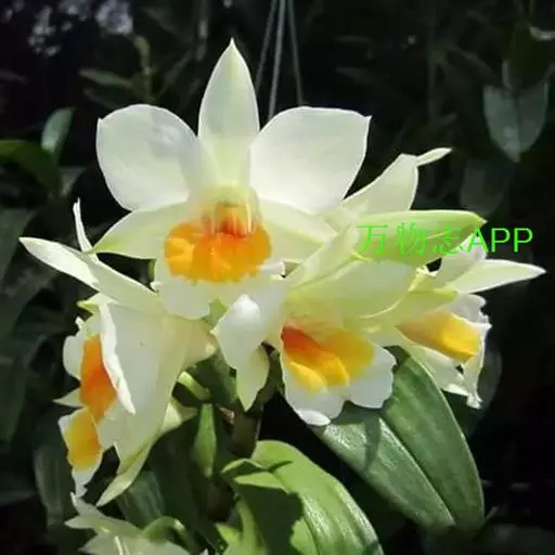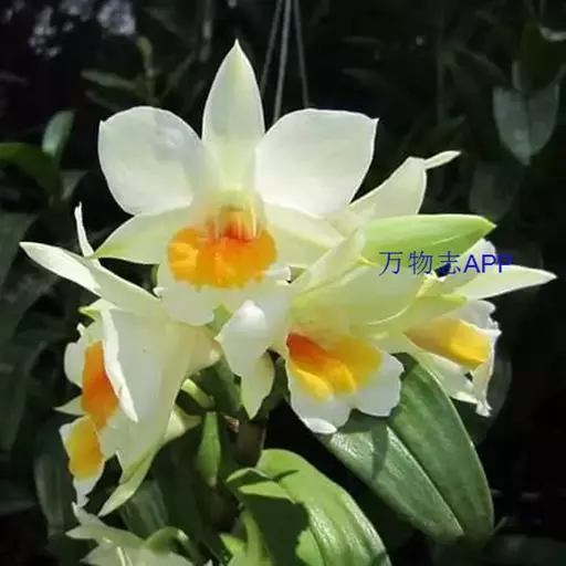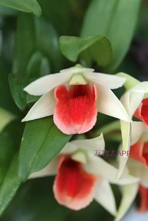 翅萼石斛(学名:Dendrobium cariniferum Rchb. f.):茎肉质状粗厚,圆柱形或有时膨大呈纺锤形,具6个以上的节。叶革质,数枚,二列,长圆形或舌状长圆形。总状花序出自近茎端,常具1-2朵花;花开展,质地厚,具橘子香气;花瓣白色,长圆状椭圆形,长约2厘米,宽1厘米,先端锐尖,具5条脉;唇瓣喇叭状,3裂。蒴果卵球形,粗达3厘米。花期3-4月。