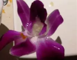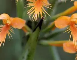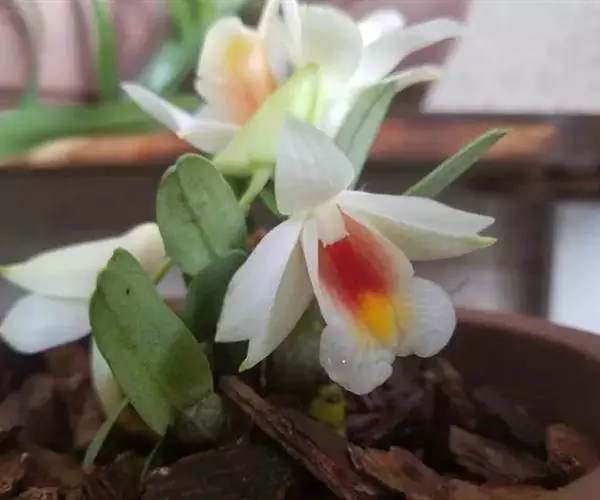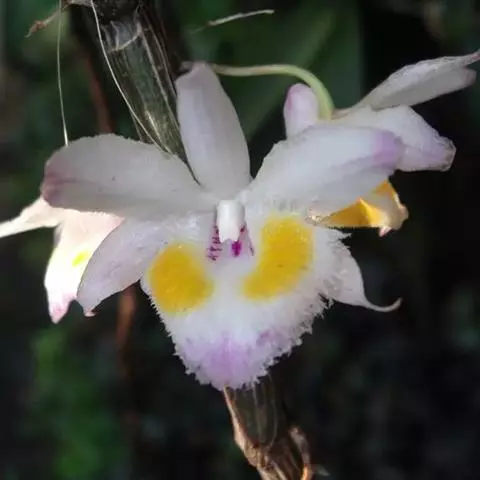 花瓣白色,长圆状椭圆形,长约2厘米,宽1厘米,先端锐尖,具5条脉;唇瓣喇叭状,3裂;侧裂片橘红色,围抱蕊柱,近倒卵形,前端边缘具细齿;中裂片黄色,近横长圆形,先端凹,前端边缘具不整齐的缺刻;唇盘橘红色,沿脉上密生粗短的流苏;蕊柱白色带橘红色,长约7毫米;药帽白色,半球形,前端边缘密生乳突状毛。