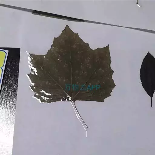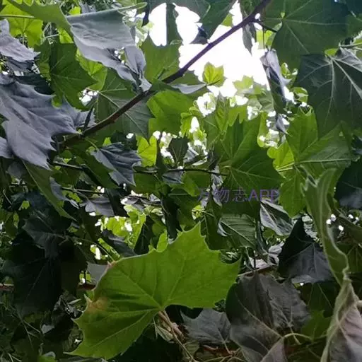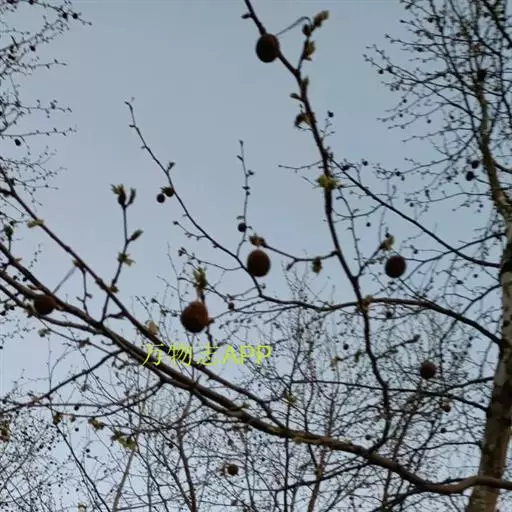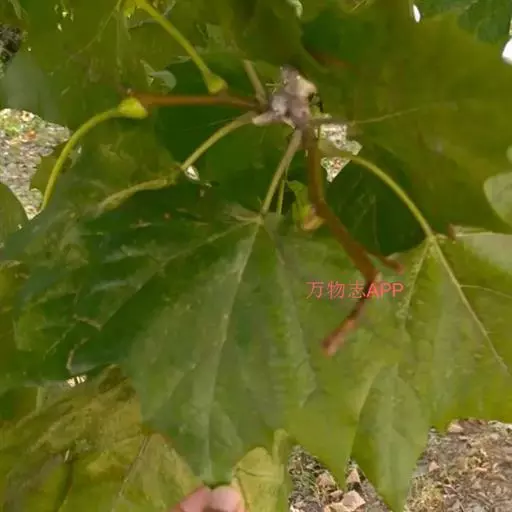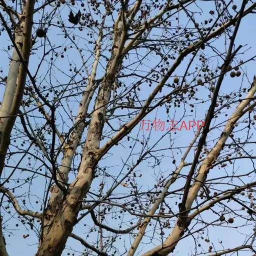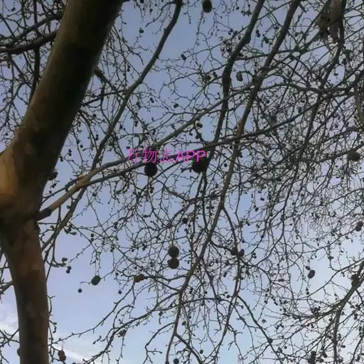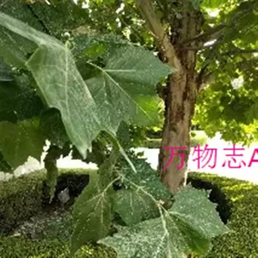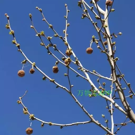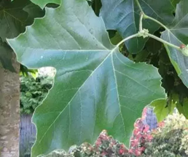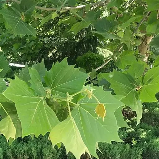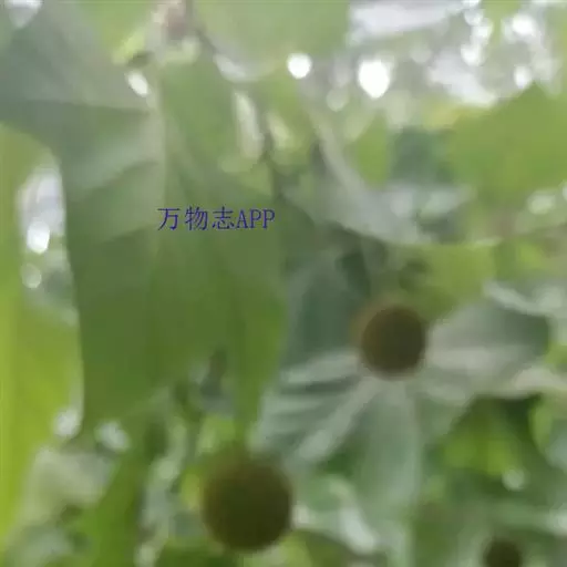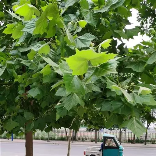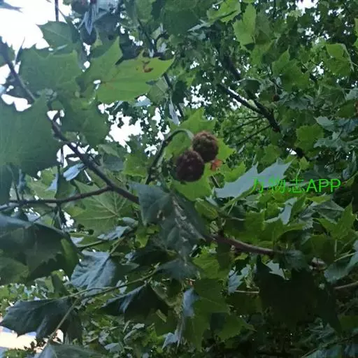 一球悬铃木 落叶大乔木,高40余米;树皮有浅沟,呈小块状剥落;嫩枝有黄褐色绒毛被。叶大、阔卵形,通常3浅裂,稀为5浅裂,宽10-22cm,长度比宽度略小;基部截形,阔心形,或稍呈楔形;裂片短三角形,宽度远较长度为大,边缘有数个粗大锯齿;上下两面初时被灰黄色绒毛,不久脱落,上面秃净,下面仅在脉上有毛,掌状脉3条,离基约1厘米;叶柄长4-7cm,密被绒毛;托叶较大,长约2-3cm,基部鞘状,上部扩大呈喇叭形,早落。