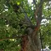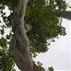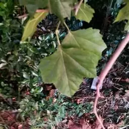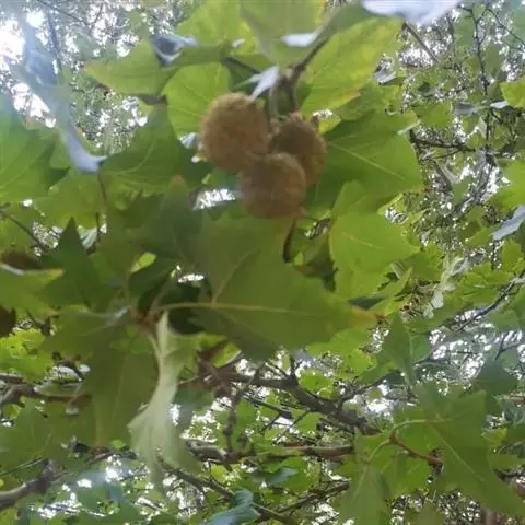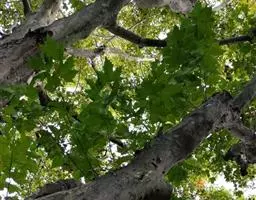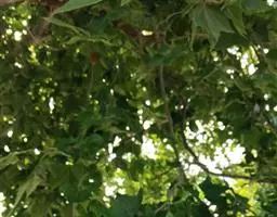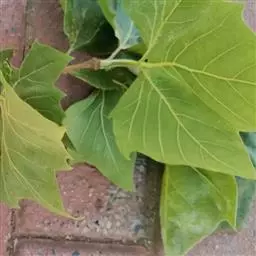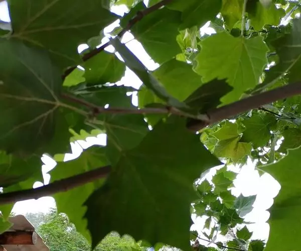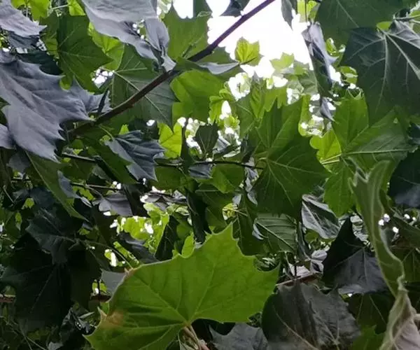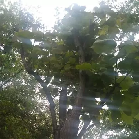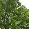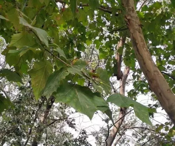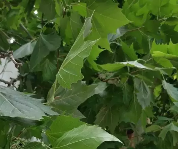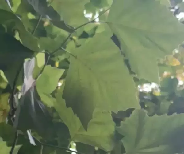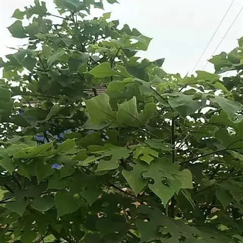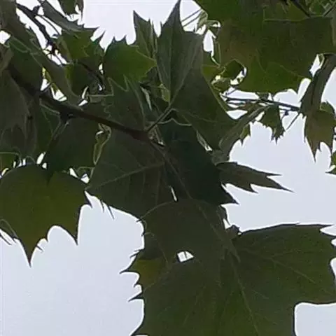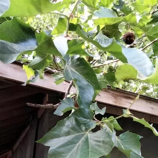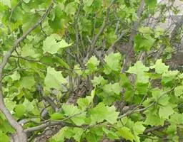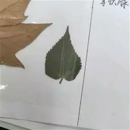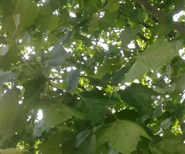 一球悬铃木 落叶大乔木,高40余米;树皮有浅沟,呈小块状剥落;嫩枝有黄褐色绒毛被。叶大、阔卵形,通常3浅裂,稀为5浅裂,宽10-22cm,长度比宽度略小;基部截形,阔心形,或稍呈楔形;裂片短三角形,宽度远较长度为大,边缘有数个粗大锯齿;上下两面初时被灰黄色绒毛,不久脱落,上面秃净,下面仅在脉上有毛,掌状脉3条,离基约1厘米;叶柄长4-7cm,密被绒毛;托叶较大,长约2-3cm,基部鞘状,上部扩大呈喇叭形,早落。