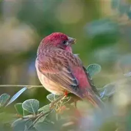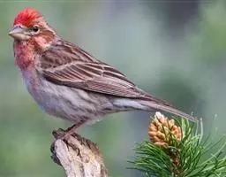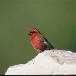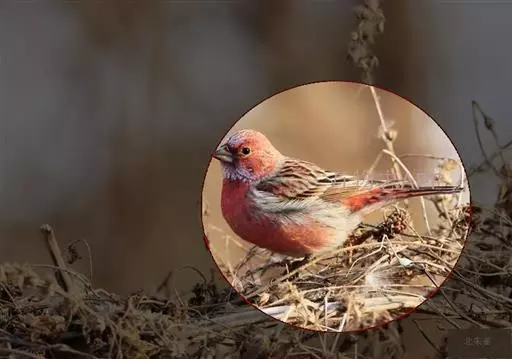 红腰朱雀:体长12-14厘米,小型鸟类。雄鸟前额和眉纹玫瑰粉红色,头顶和一宽的贯眼带深红褐色,背红…