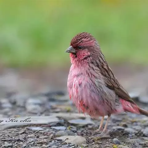 北朱雀(学名:Carpodacus roseus):雄鸟额前头及喉均银白色,具粉红色羽缘,呈鳞片状,头顶余部及后颈粉红,背灰褐而羽缘粉红,具较宽黑色羽干纹,腰和尾上覆粉红色,尾羽黑褐色,外羽片具粉红色边缘。飞羽黑褐色,具棕白沾粉红边缘;翅上覆羽具近白沾粉红的宽阔羽端,形成两道横斑。下体均呈粉红色,下腹近白;腋羽及尾下覆羽白,染粉红色。雌鸟头顶、头侧灰褐,羽缘粉红,各羽具黑褐色羽干纹,背灰褐,杂以粉红色,尾羽外羽片棕白色。下体棕白,杂以较明显粉红色,具黑褐色羽干纹,余者和雄鸟相似。虹膜:红色,嘴棕褐色,脚深灰褐色。
