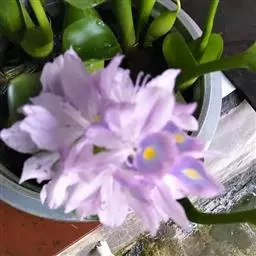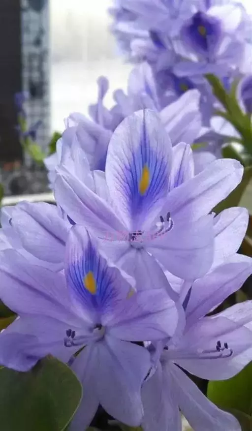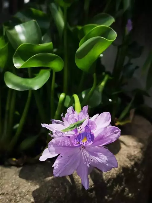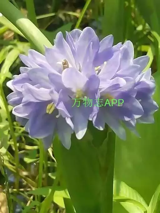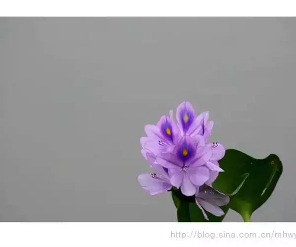 凤眼蓝是浮水草本植物,须根发达, 凤眼蓝 茎极短,花为浅蓝色,呈多棱喇叭状,上方的花瓣较大;花瓣中心生有一明显的鲜黄色斑点,形如凤眼,也像孔雀羽翎尾端的花点,非常养眼、靓丽。常是园林水景中的造景材料。植于小池一隅,以竹框之,野趣幽然。